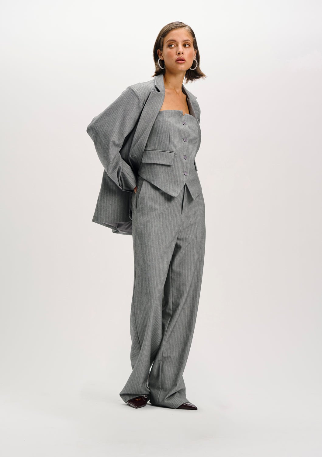 De Steijn Corset Top in grijs van Refined Department is een getailleerd topje met een stijlvolle pinstripeprint. Het item heeft een V-uitsnede aan de onderzijde, decoratieve klepzakjes en een verstelbare gesp aan de achterkant voor de perfecte pasvorm. De knoopsluiting aan de voorzijde geeft het corset een structured look. Combineer met de bijpassende blazer of pantalon voor een complete co-ord set.
