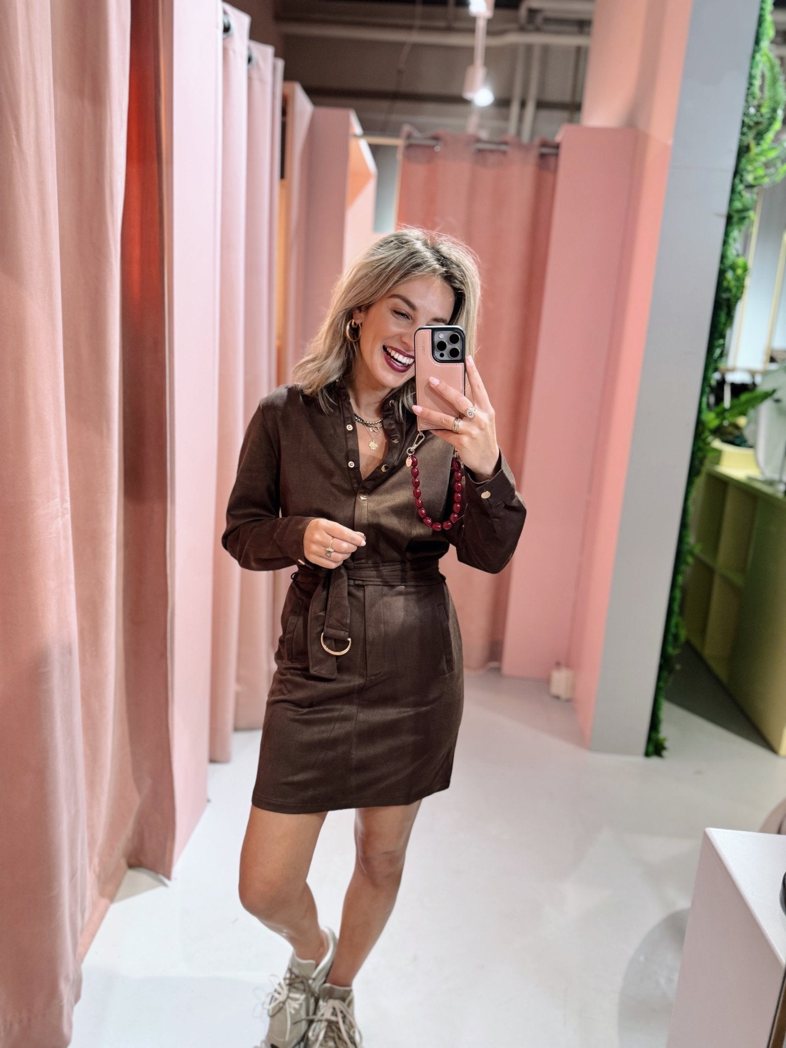 De Tarah Dress in bruin is een suède-look jurk met lange mouwen en twee steekzakken. De jurk is voorzien van een kraagje en een knoopsluiting en wordt geleverd met een bijpassende tailleband.