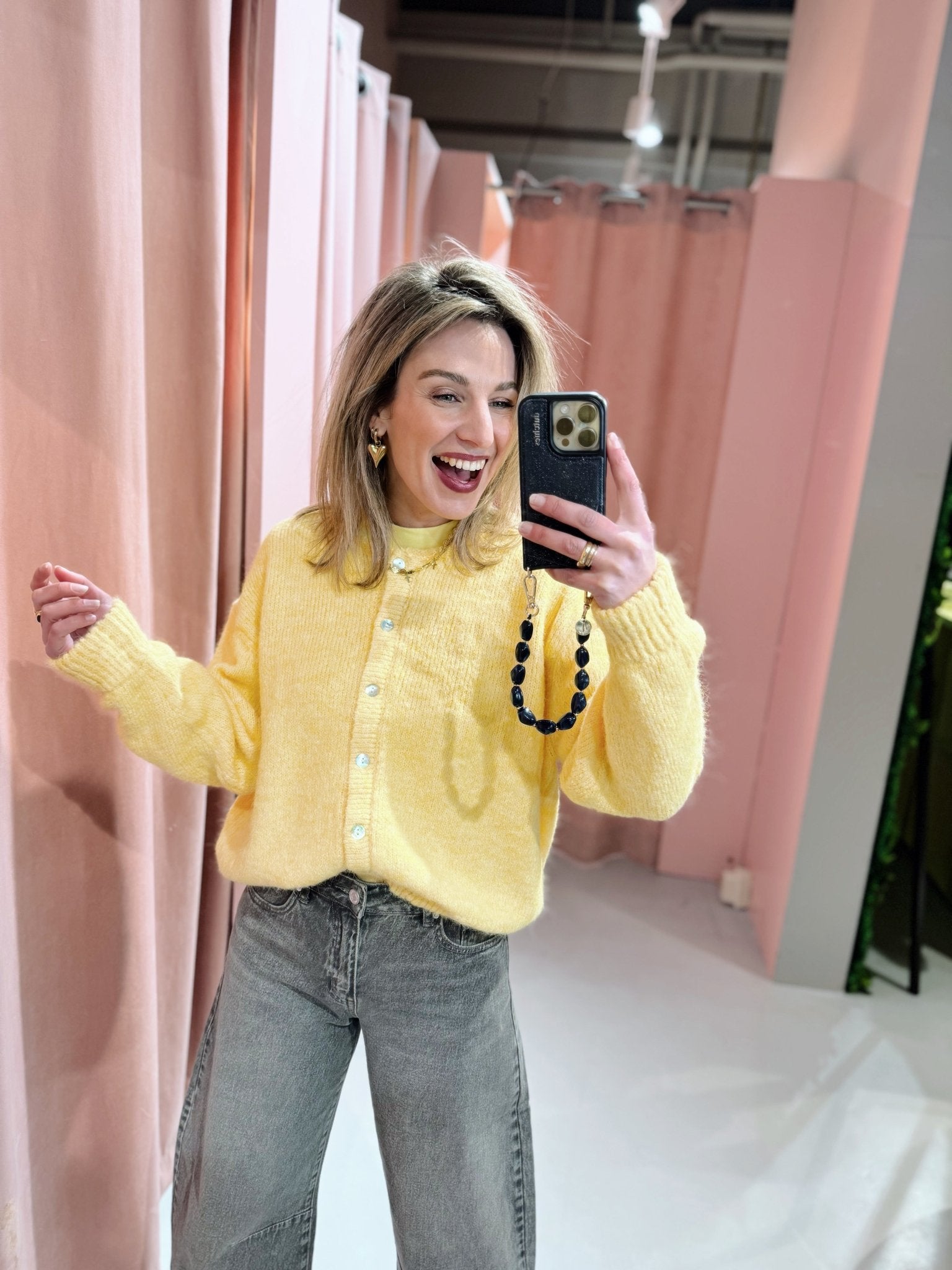 De Tiara Cardigan in geel is gemaakt van een gebreid materiaal, waardoor hij heerlijk warm is! Het vest heeft lange mouwen, een ronde halslijn en is afgewerkt met holografische knopen aan de voorkant.