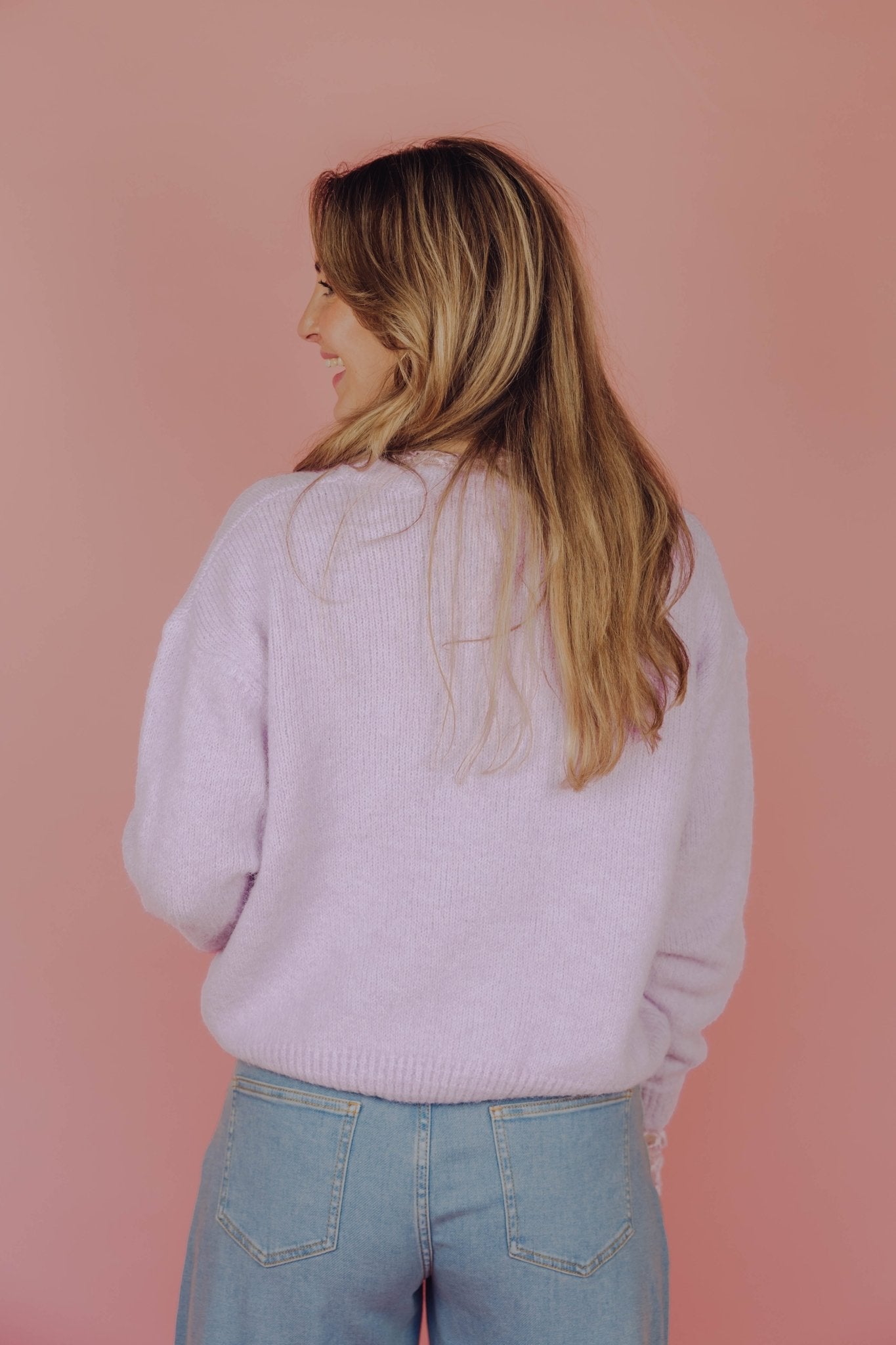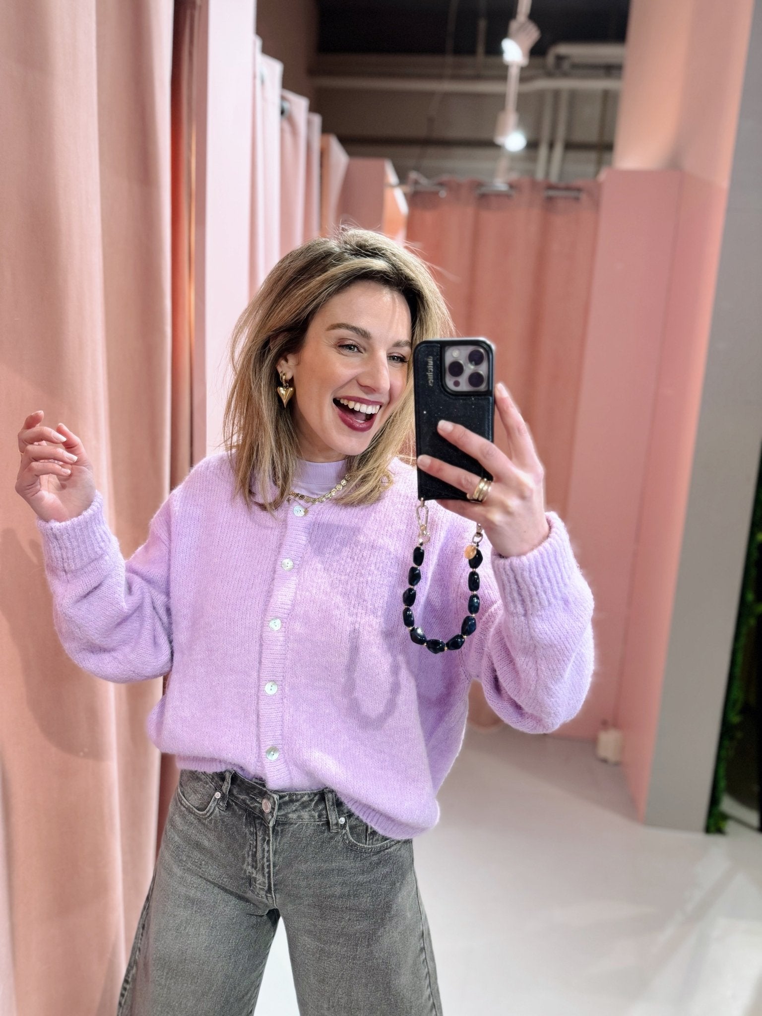 De Tiara Cardigan in lila is gemaakt van een gebreid materiaal, waardoor hij heerlijk warm is! Het vest heeft lange mouwen, een ronde halslijn en is afgewerkt met holografische knopen aan de voorkant.