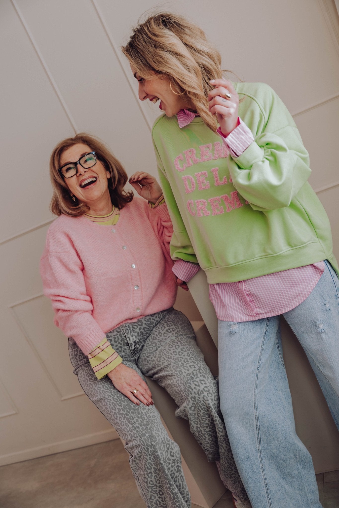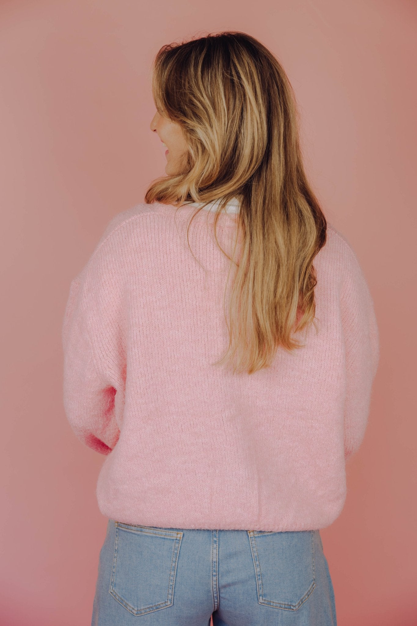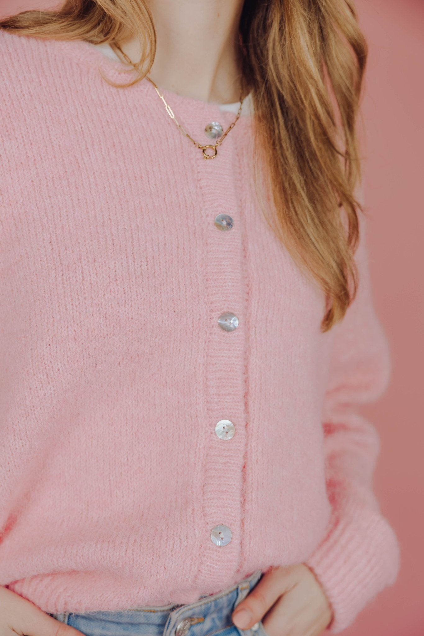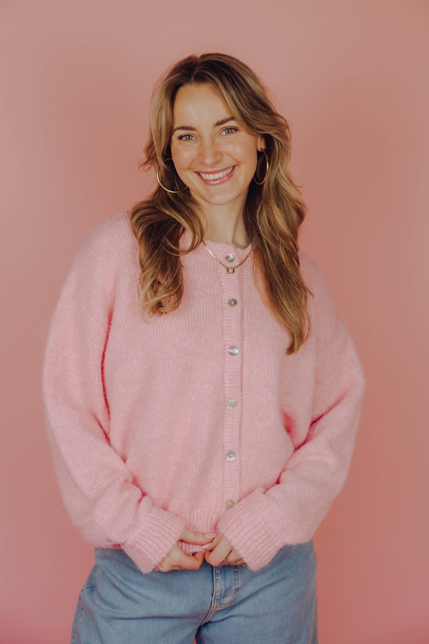 De Tiara Cardigan in roze is gemaakt van een gebreid materiaal, waardoor hij heerlijk warm is! Het vest heeft lange mouwen, een ronde halslijn en is afgewerkt met holografische knopen aan de voorkant.
