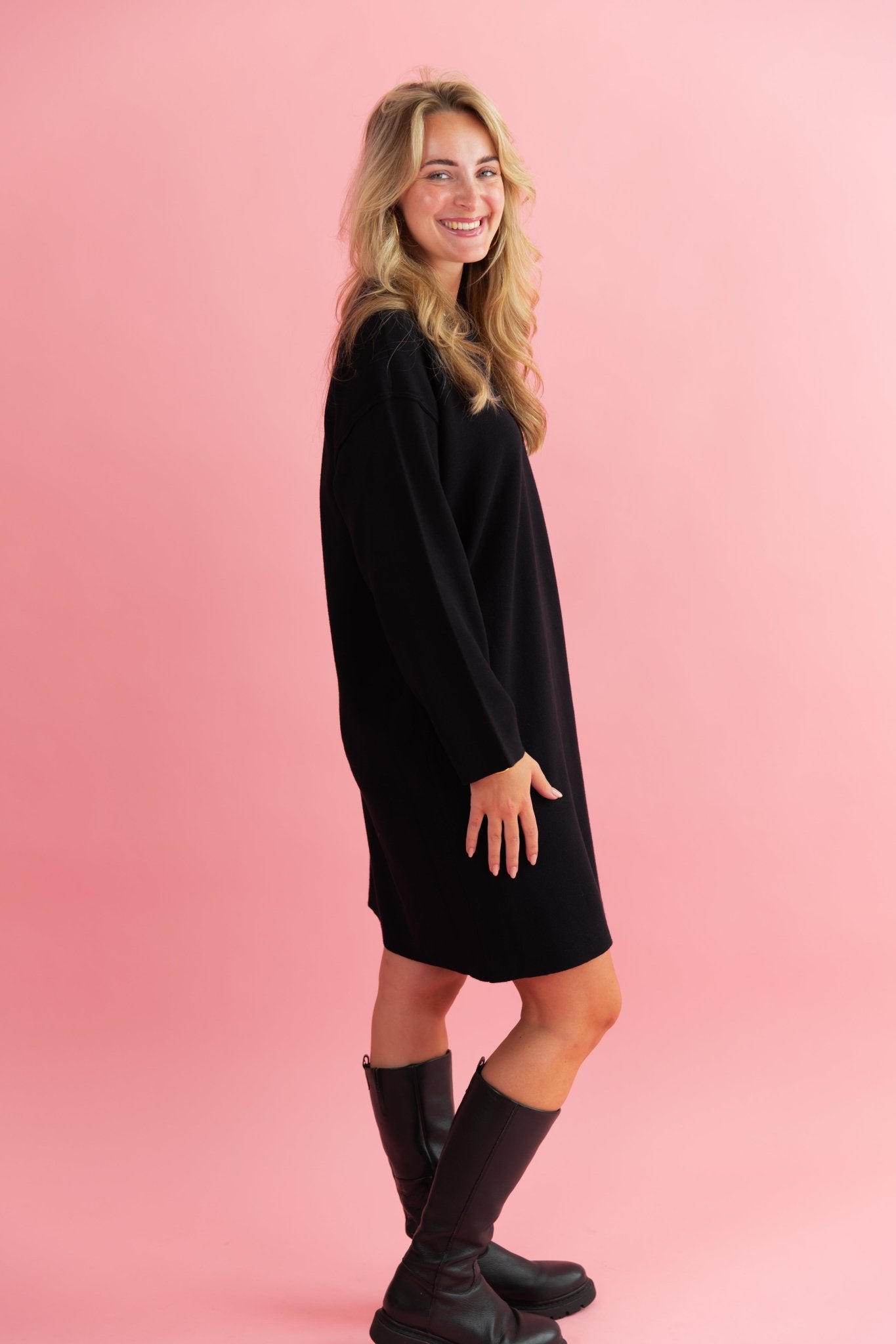 De Yara Dress in zwart is een midi jurk gemaakt van een heerlijk zacht materiaal, waardoor hij heerlijk warm is. De jurk is voorzien van een kraagje met een rits en is leuk te combineren met een paar stoere boots en een trenchcoat!